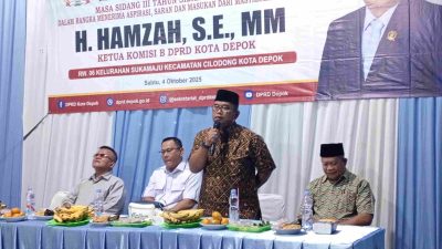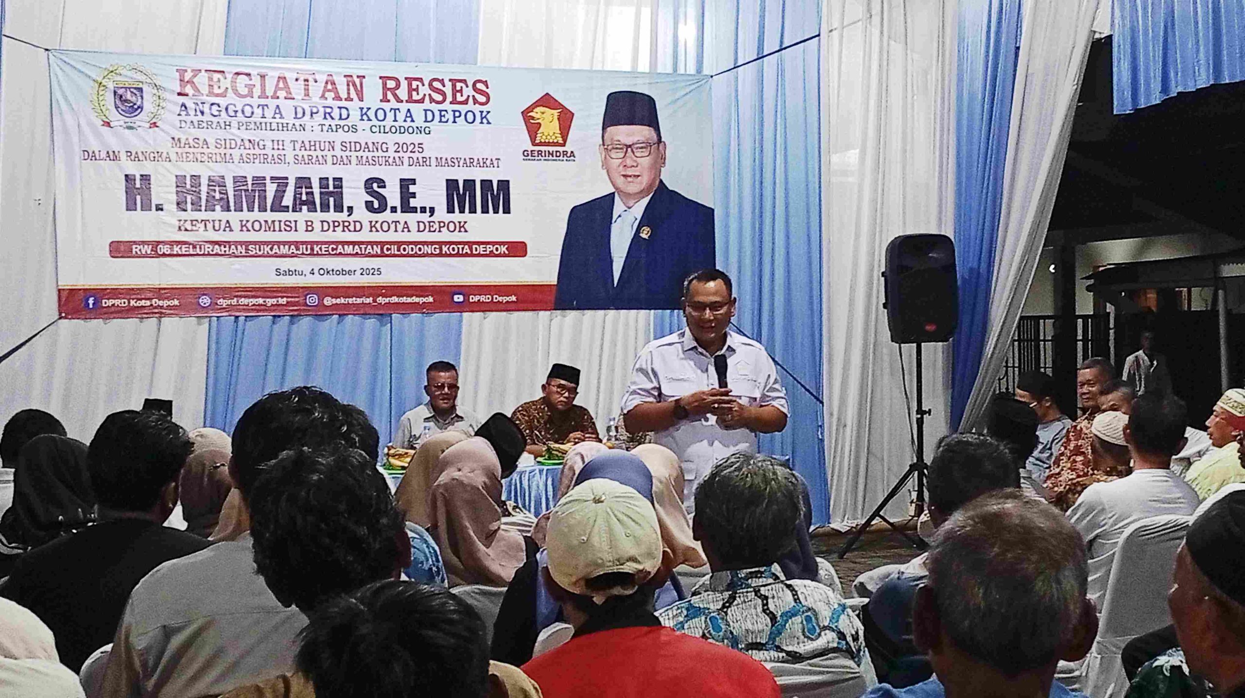 — Anggota DPRD Kota Depok dari Fraksi Partai Gerindra H. Hamzah, S.E., M.M., yang juga menjabat sebagai Ketua Komisi B DPRD Kota Depok, melaksanakan kegiatan Reses Masa Sidang III Tahun 2025 di Lapangan RW 06, Kelurahan Sukamaju, Kecamatan Cilodong, pada Sabtu (10/10/2025).