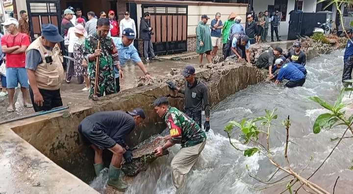 Satuan Tugas SDA Dinas PUPR Kota Depok bersama Babinsa melakukan penanganan darurat dengan mengevakuasi puing-puing dan menutup titik turap yang jebol untuk mencegah luapan kembali.